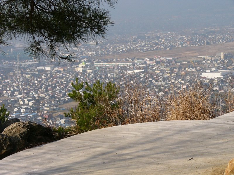 早起きして信夫山の烏ケ崎へ行こうと思っていたのですが、寝坊をしてしまい朝食を食べずに出発、9時前に着いたものの周囲は霞んでいました。1年ぶりの烏ケ崎は、手すりこそ無かったのですが、妙な台?がありました。不思議そうに見ていると毎日信夫山を歩いているというYさんが来て、「これもねー、反対したんだけれど作っちゃったんだよねー」と、施設を作るのはいいけれど自然が壊されるのとゴミが増えるのが残念だと話てくれました。信夫山の事をもっと聞きたかったのですが、午前中に根本金物さんでエンバランスのシーツを買って来てと頼まれていたのであわだだしく下山しました。 |