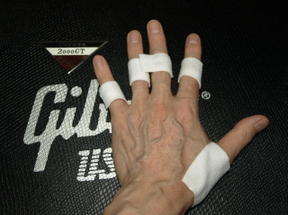 7月に入ったら左手の親指だけでなく全部痛くなり毎晩こんな状態でした。下手なのを指のせいにするのは面白くないので「左手がダメなら右手があるさ!」と左利き用のギターを使えばいいんだと開き直っていたら8月末には痛みが気にならなくなりました。 |